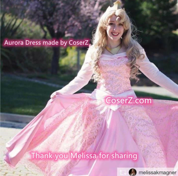 Pink Princess Aurora dress with golden floral version designs. Thank you very much our customer Melissa for sharing.
